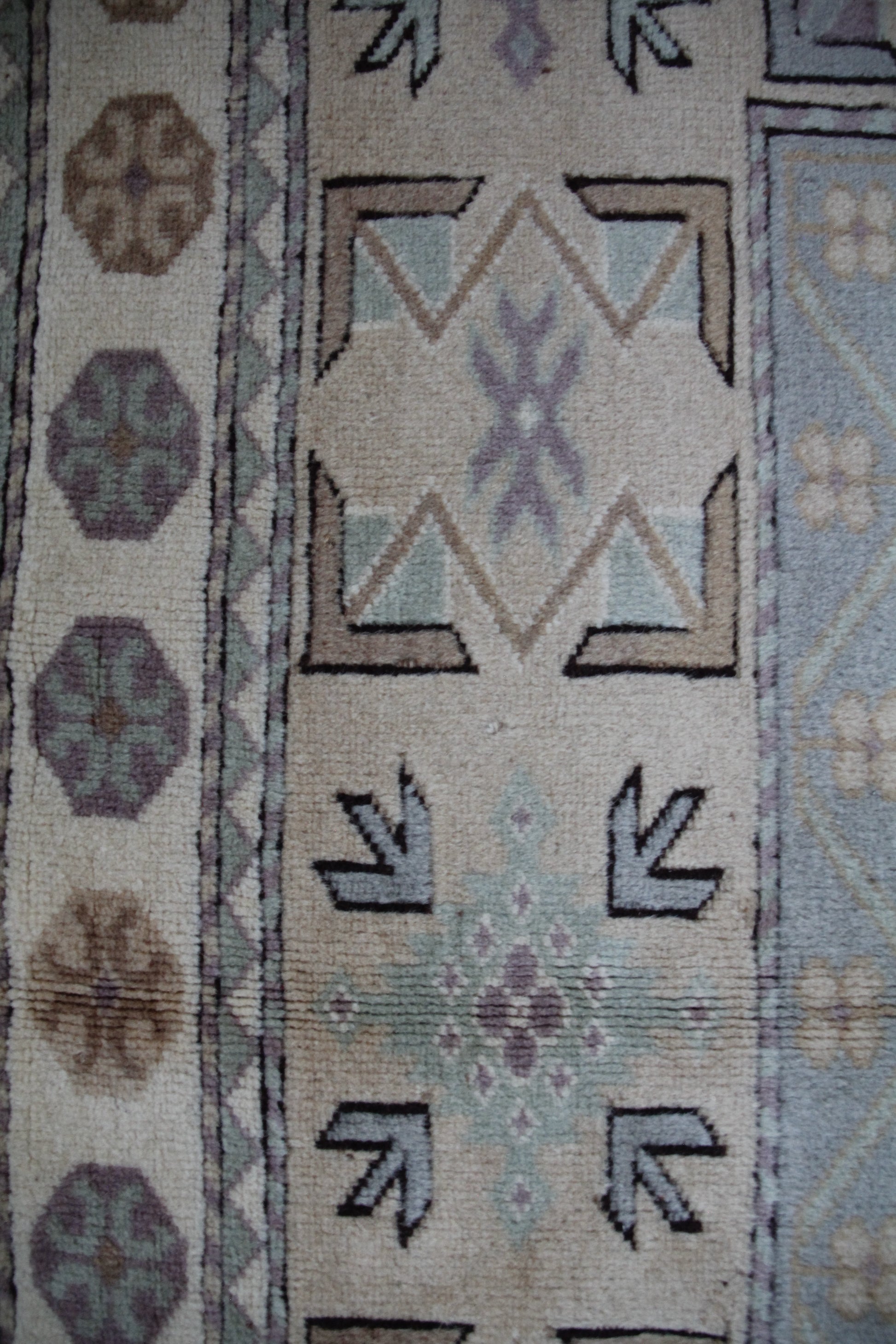 This vintage wool rug from Milas, Muğla, Turkey, features a unique 'ram's horn' pattern and was handwoven using traditional techniques over 70 to 80 years ago.