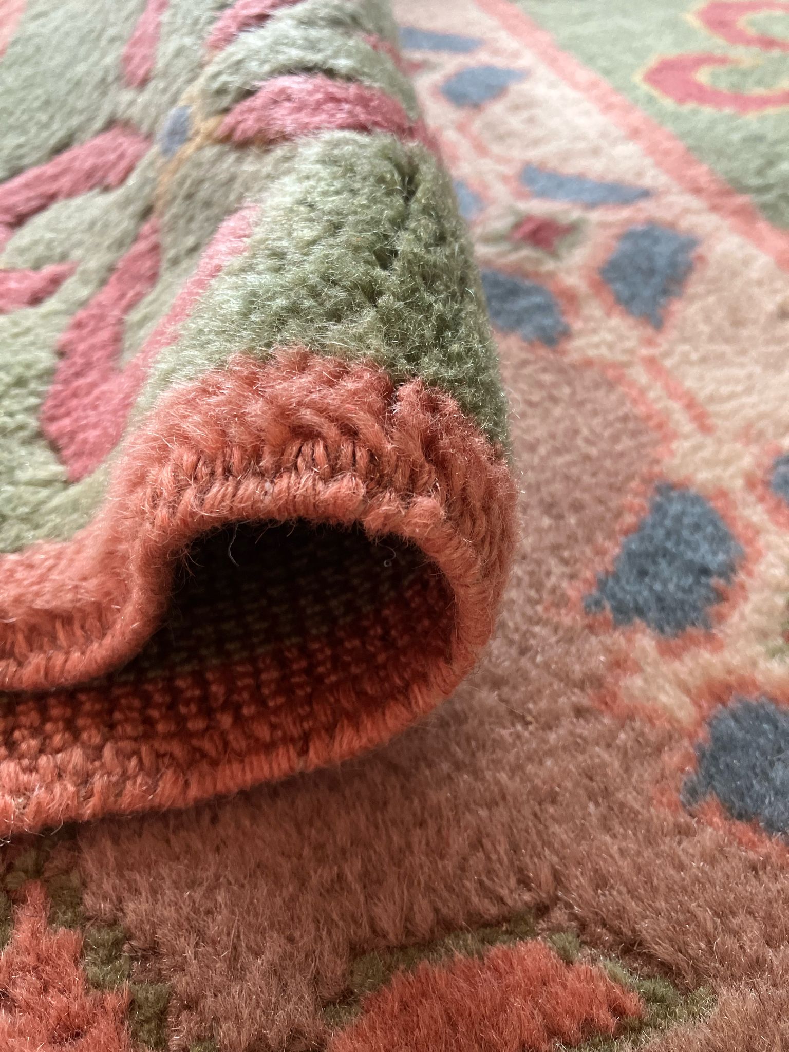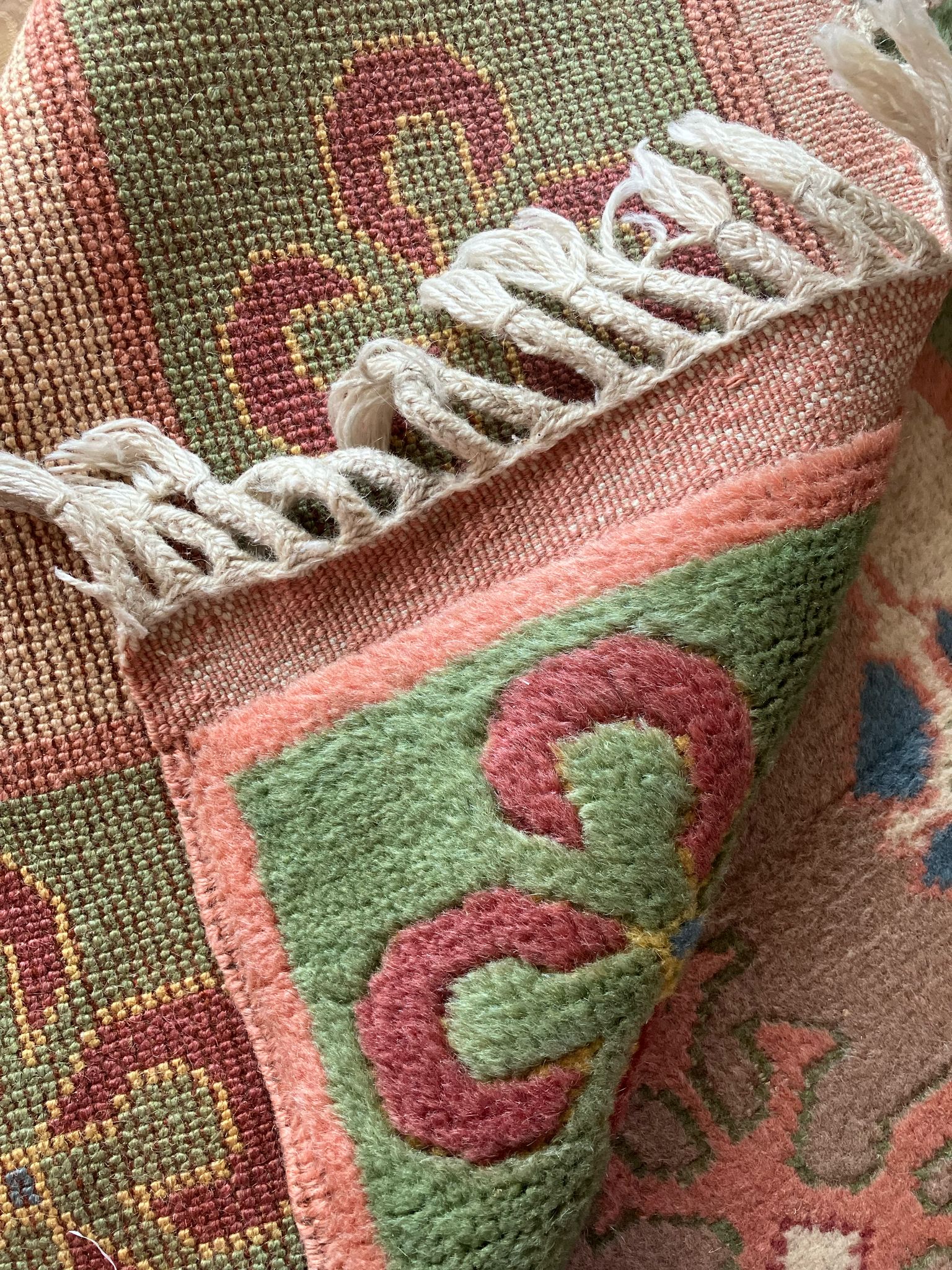 This vintage wool rug from İzmir, Turkey, was handwoven using traditional techniques over 50 to 60 years ago.